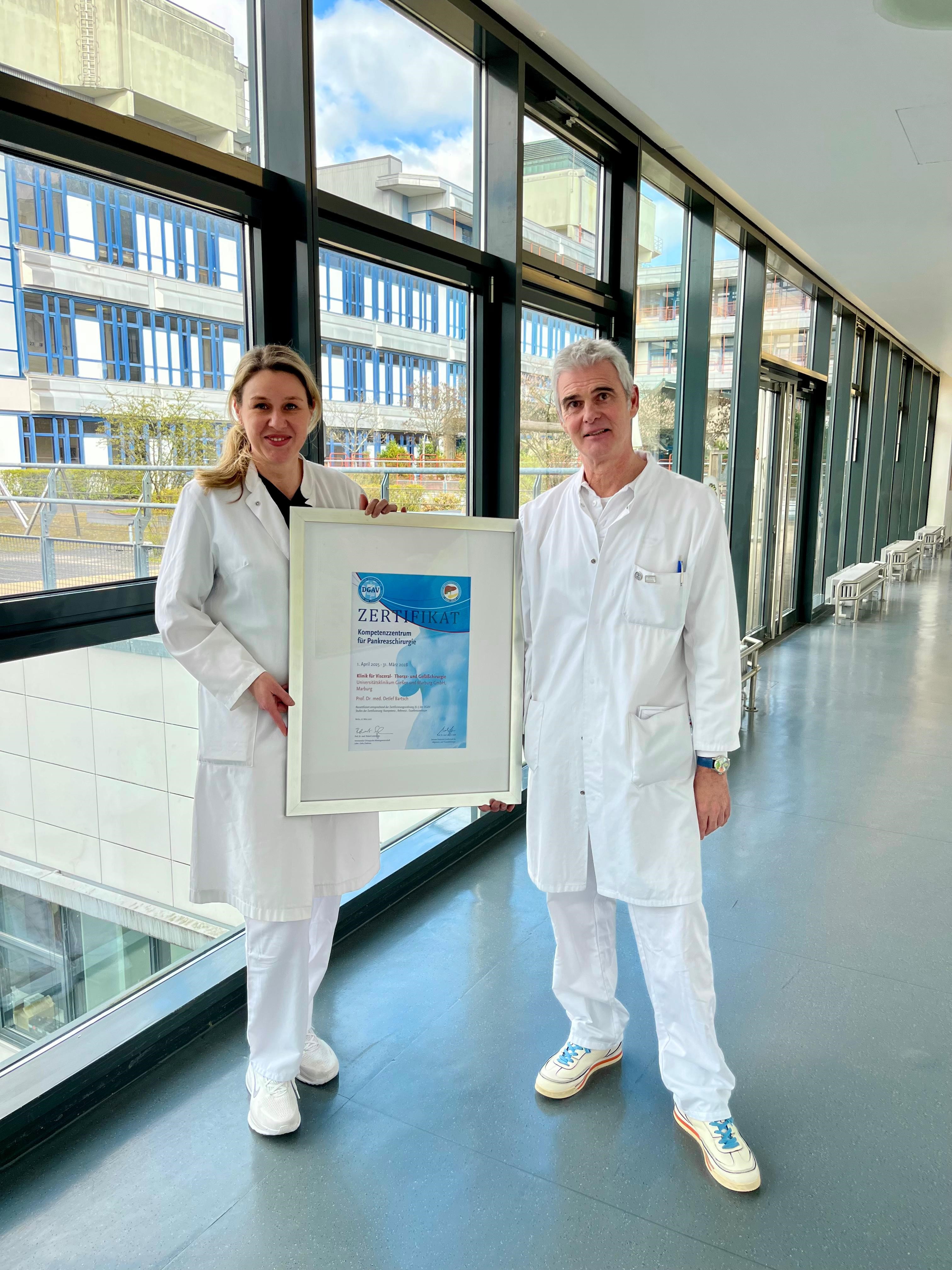 Aufgrund der Leistungszahlen und Ergebnisqualität wurde die Klinik im Oktober 2022 erneut durch die Deutsche Gesellschaft für Allgemein- und Visceralchirurgie als Kompetenzzentrum für Pankreaschirurgie zertifiziert. Besonders gefreut hat uns, dass uns bezüglich der Sterblichkeitsrate (1,1%) und der klinisch relevanten Komplikationen (10,2%), eine vergleichsweise "exzellente Ergebnisqualität" bescheinigt wurde. Damit ist sie eine von 21 DGAV-zertifizierten Kliniken für Pankreaschirurgie in Deutschland.