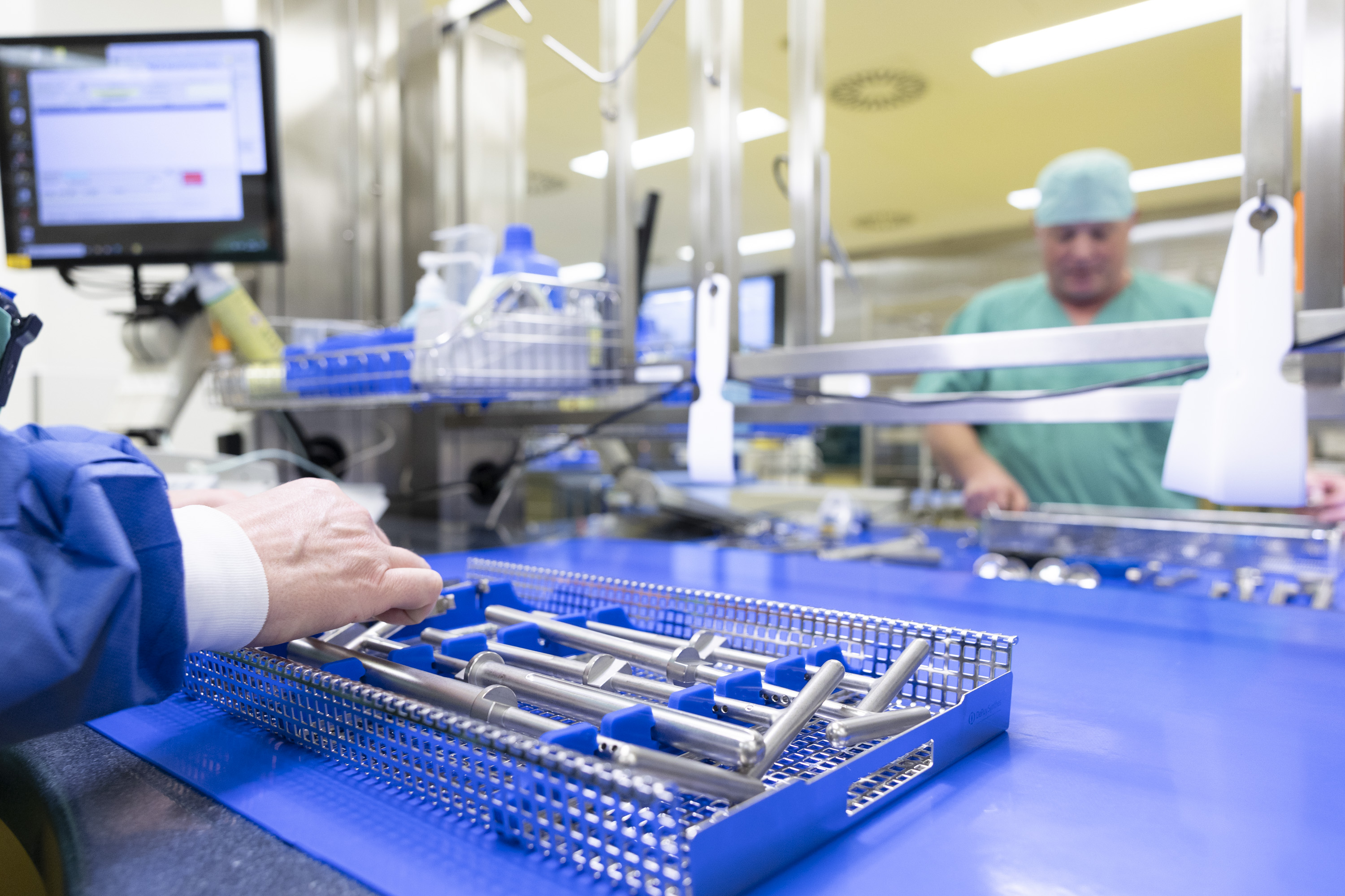 Unsere Reinigungs- und Desinfektionsflotte besteht aus fünf Einzelkammer-Reinigungs- und Desinfektionsgeräten (RDG), zwei Taktbandanlagen und einer Großraum-RDG-/Containerwaschanlage. Hier werden die Medizinprodukte nach der Vorbehandlung alkalisch gereinigt und thermisch desinfiziert, um Verschmutzungen und Kontaminationen zu beseitigen und die Sicherheit bei den weiteren Aufbereitungsschritten zu unterstützen.
