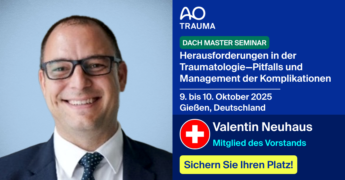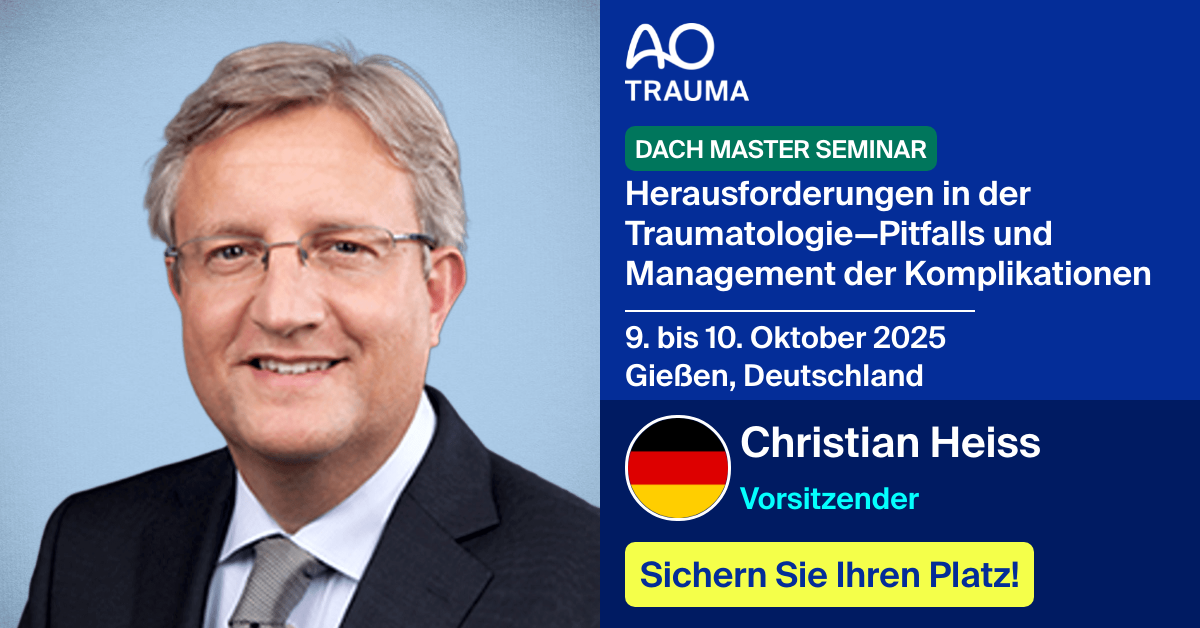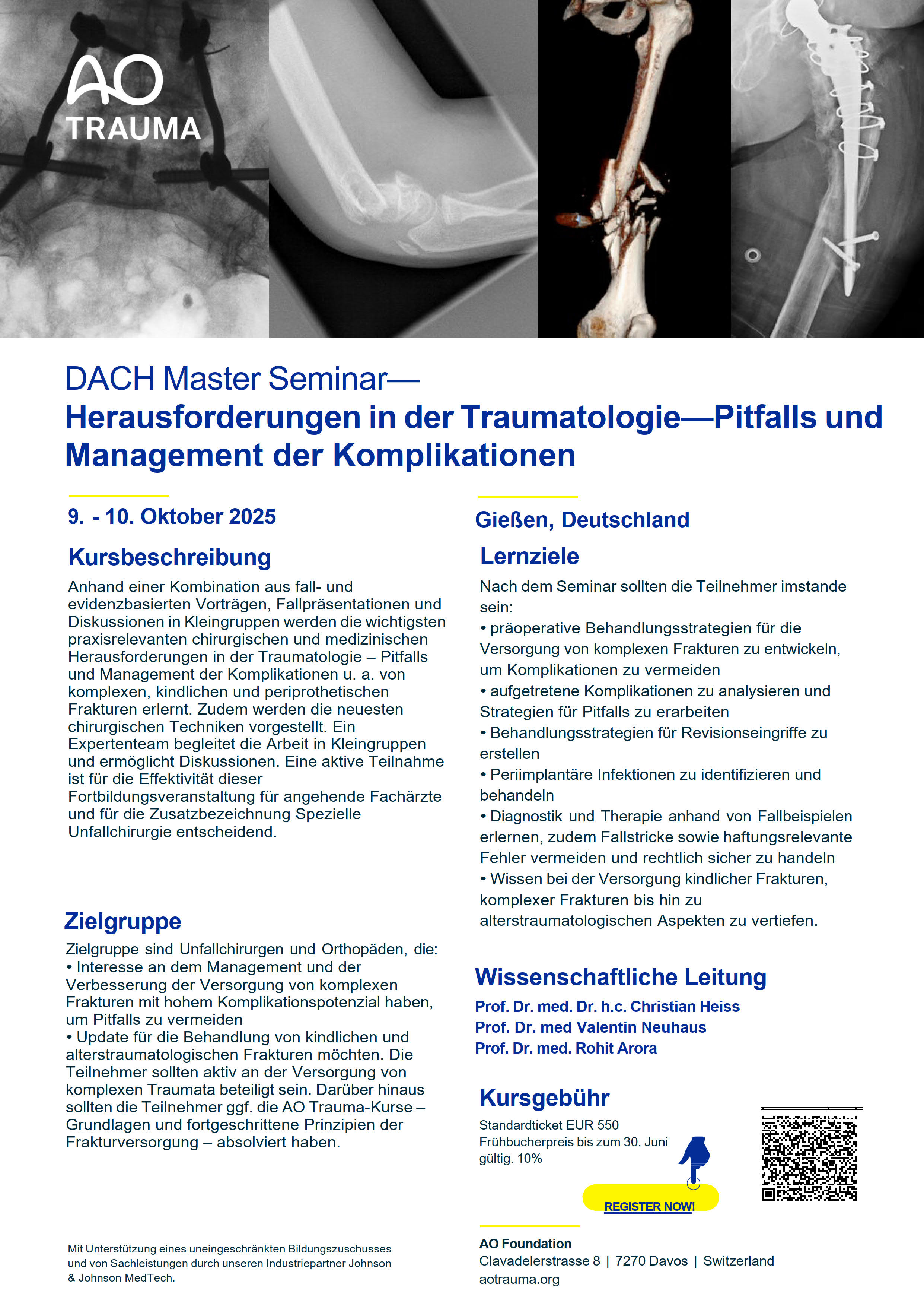 Anhand einer Kombination aus fall- und evidenzbasierten Vorträgen, Fallpräsentationen und Diskussionen in Kleingruppen werden die wichtigsten praxisrelevanten chirurgischen und medizinischen Herausforderungen in der Traumatologie - Pitfalls und Management der Komplikationen u.a. von komplexen, kindlichen und periprothetischen Frakturen erlernt.