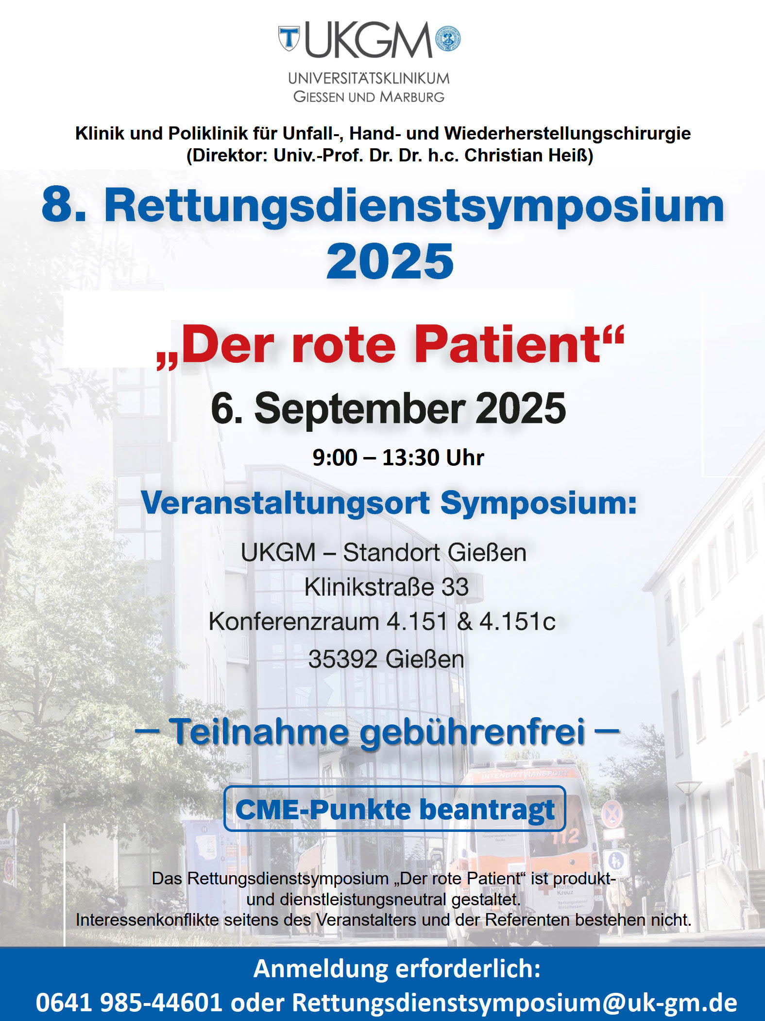 Das Rettungsdienstsymposium "Der rote Patient" ist produkt- und/oder dienstleistungsneutral gestaltet. Interessenkonflikte seitens des Veranstalters und der Referenten bestehen nicht. Ein Sponsoring der Veranstaltung liegt nicht vor.
