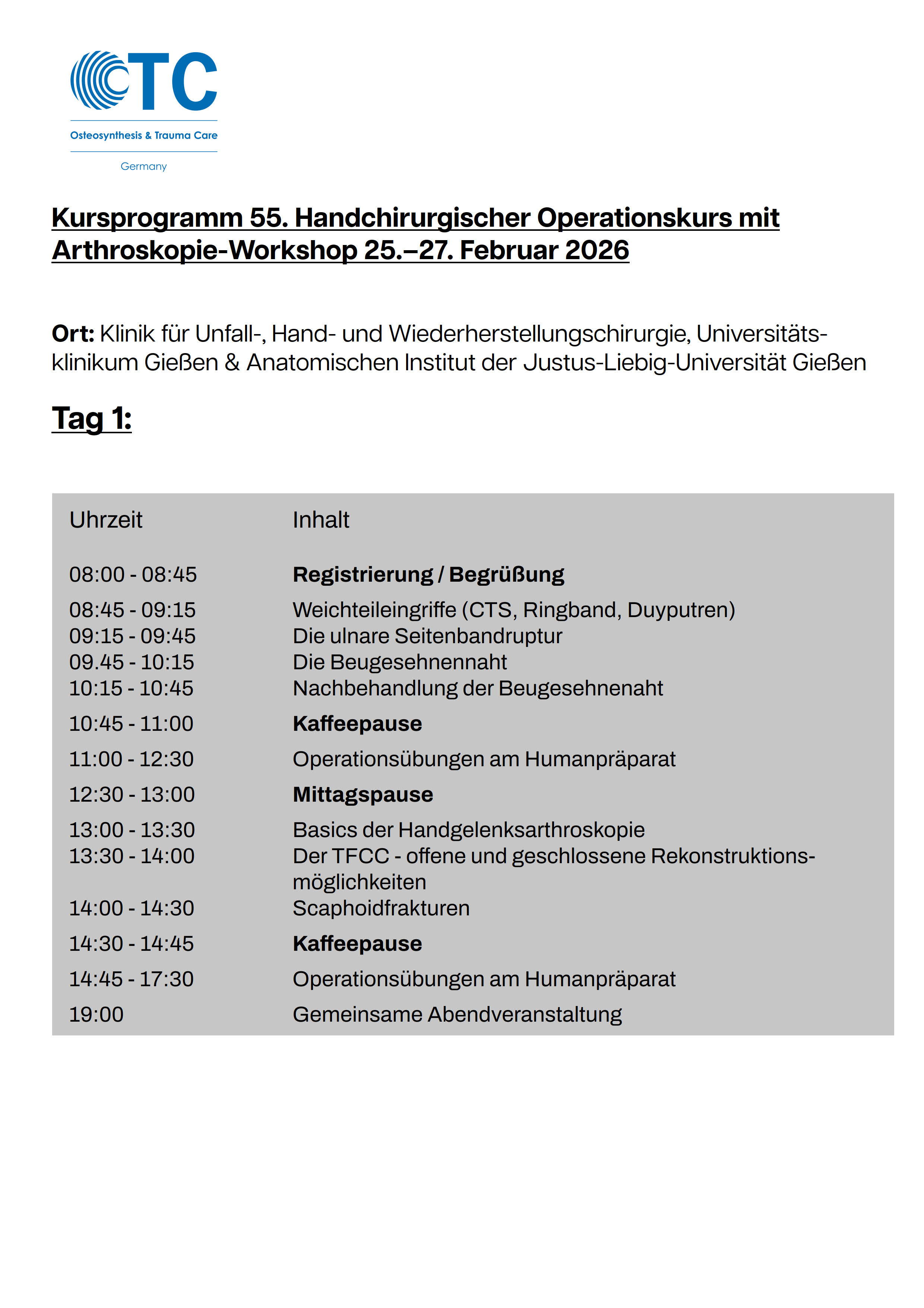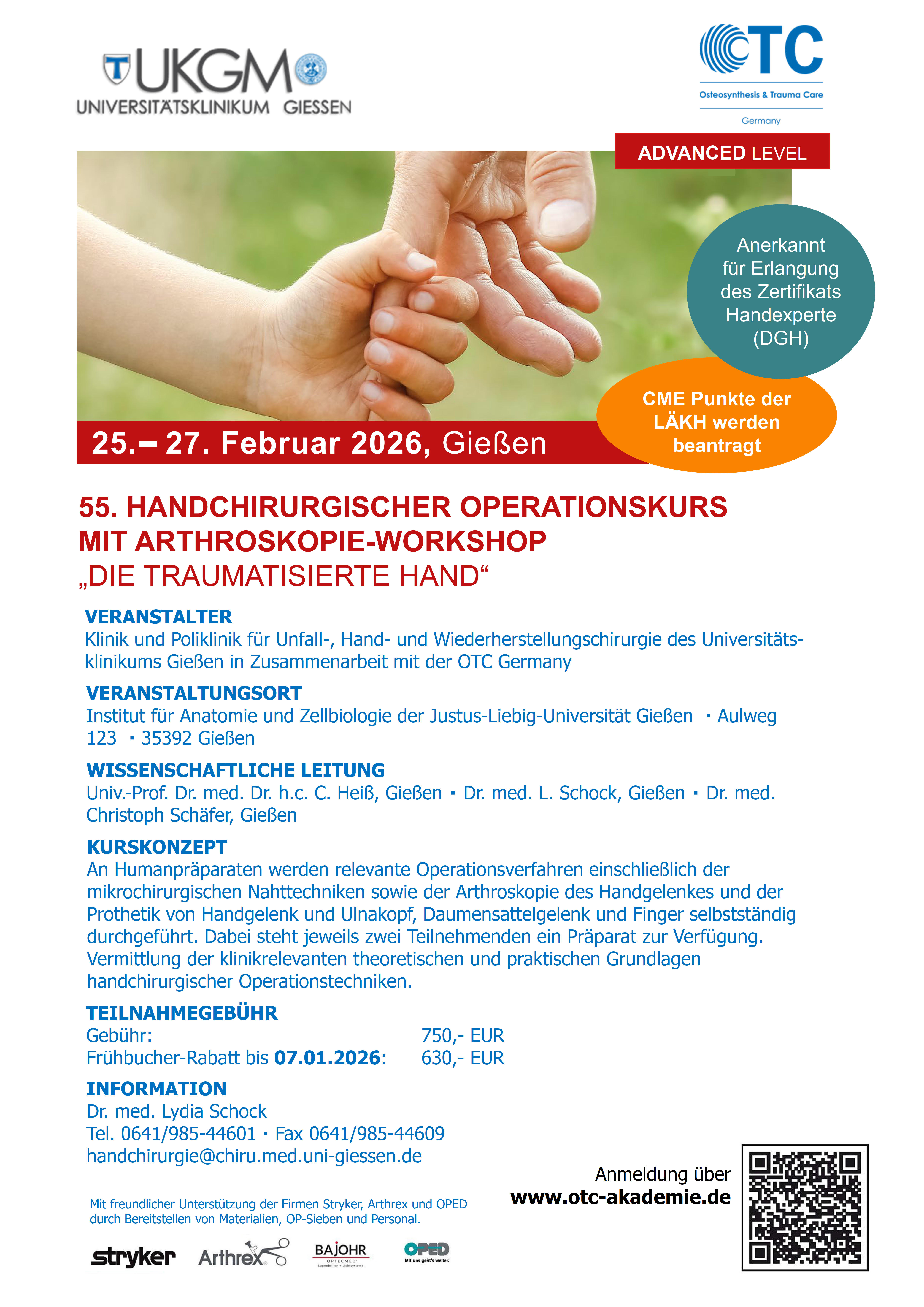 Fortbildungsveranstaltung der Klinik und Poliklinik für Unfall-, Hand- und Wiederherstellungschirurgie, Universitätsklinikum Gießen und Marburg, Standort Gießen (Direktor: Univ.-Prof. Dr. med. Dr. h.c. C. Heiß) in Zusammenarbeit mit dem Anatomischen Institut der Justus-Liebig-Universität Gießen und der OTC Germany
