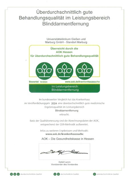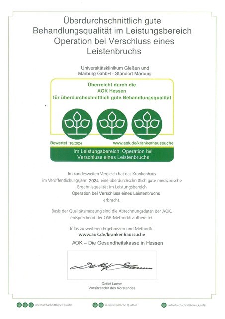 Auch in diesem Jahr ist die Klinik für VTG-Chirurgie erneut bezüglich Ihrer Qualität für überdurchschnittlich gute Behandlungsqualität im Leistungsbereich Verschluss eines Leistenbruchs sowie im Leistungsbereich Blinddarmentfernung von der AOK Hessen ausgezeichnet worden.