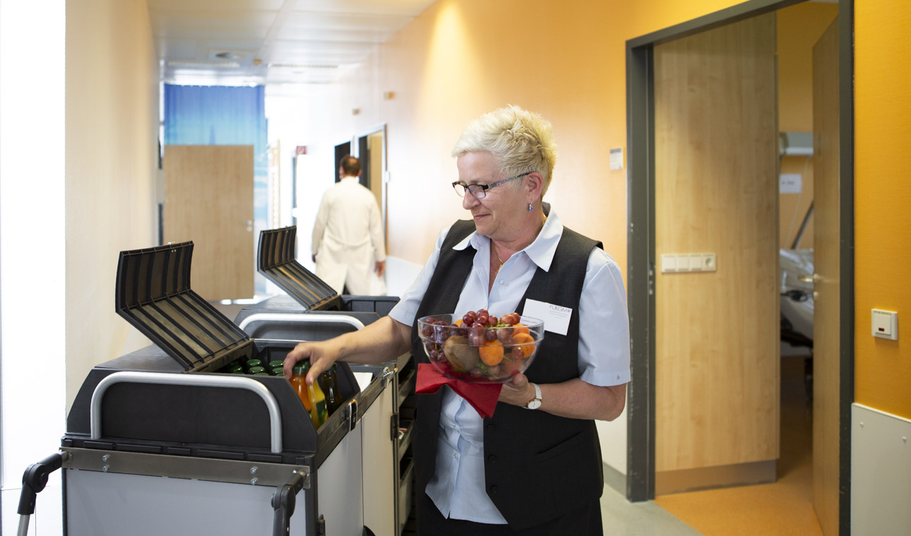 Um Ihre Menüwünsche zu erfassen, besucht Sie täglich unsere Servicekraft. Ebenfalls mit der Servicekraft kommt täglich unser frisch bestückter Servicewagen mit den mobilen Komfortelementen zu Ihnen.